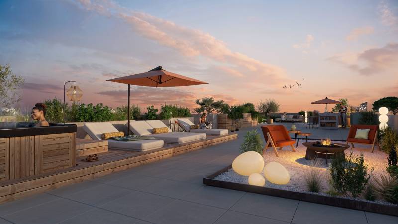 Le cœur d’îlot, signé COLOCO, se transforme en jardin méditerranéen vivant, entre pins parasols, lavandes, oliviers et rochers sculptés, offrant un paysage en mouvement au fil des saisons.